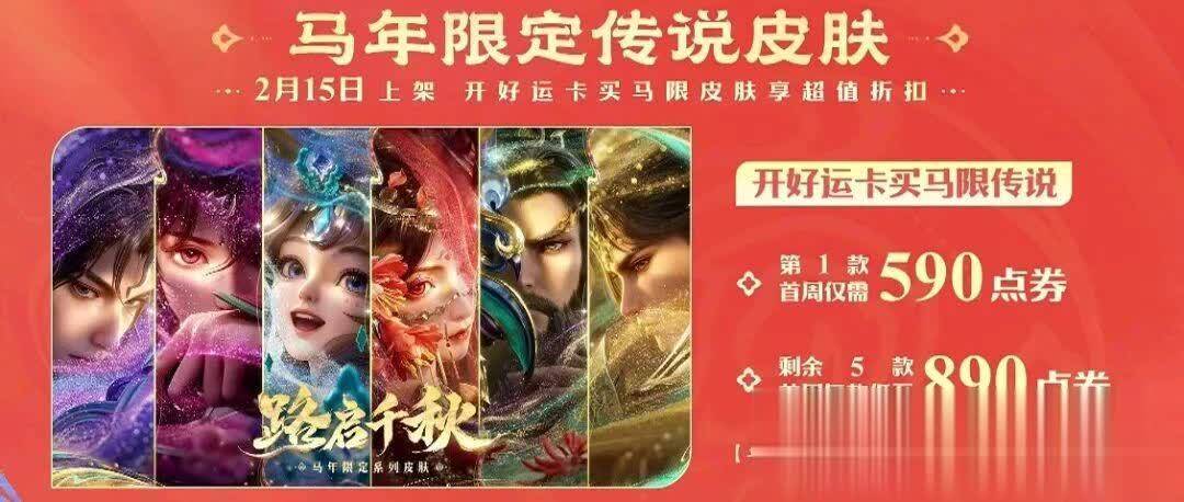 这6款皮肤将于2月15日零点上线,价格方面颇为划算。在拥有好运60卡的情况下,首款年限皮肤590点券,剩余5款,每款价格均为890点券。