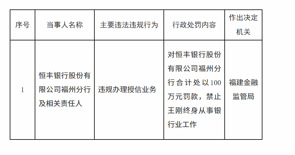 1月23日,福建金融监管局行政处罚信息公示表显示,恒丰银行股份有限公司福州分行因违规办理授信业务被合计处以100万元罚款稳益配,责任人王某被禁止终身从事银行业工作。