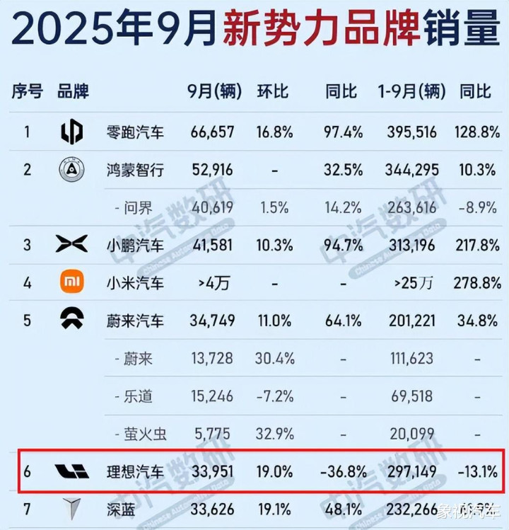 进入2025年以来,理想从“新势力销冠”宝座上跌落,甚至被挤出新势力第一梯队,滑出前五名。