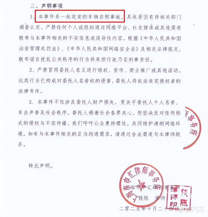 疑似当事车主的代理律师发布的公开声明中,将该事故定性为“突发的车辆自燃事故”。